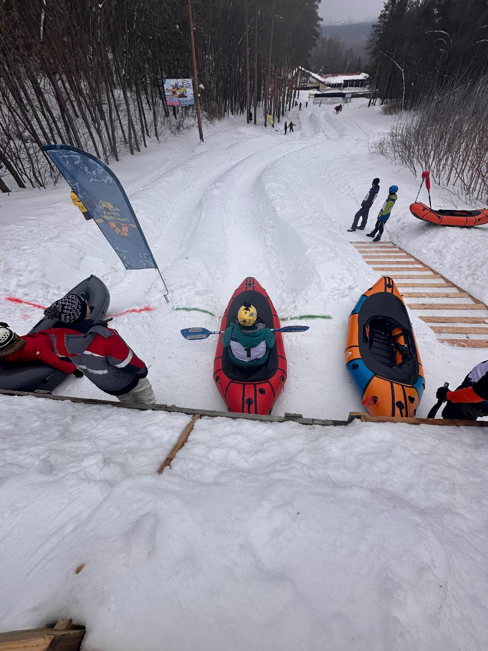 Вторым этапом "зимней части" соревнований были парные заезды по желобам тюбинговой трассы - не такой динамичный, зато более безопасный этап, тут все участники остались на борту своих лодок, чего нельзя сказать про предыдущий этап.